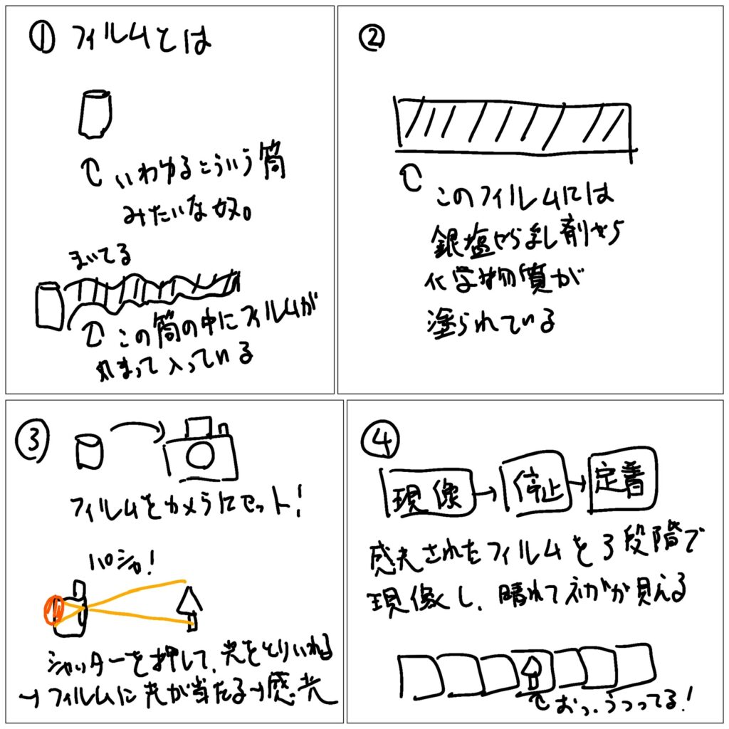 フィルムカメラとは下の絵のように、フィルムをカメラに装填して撮っていました。